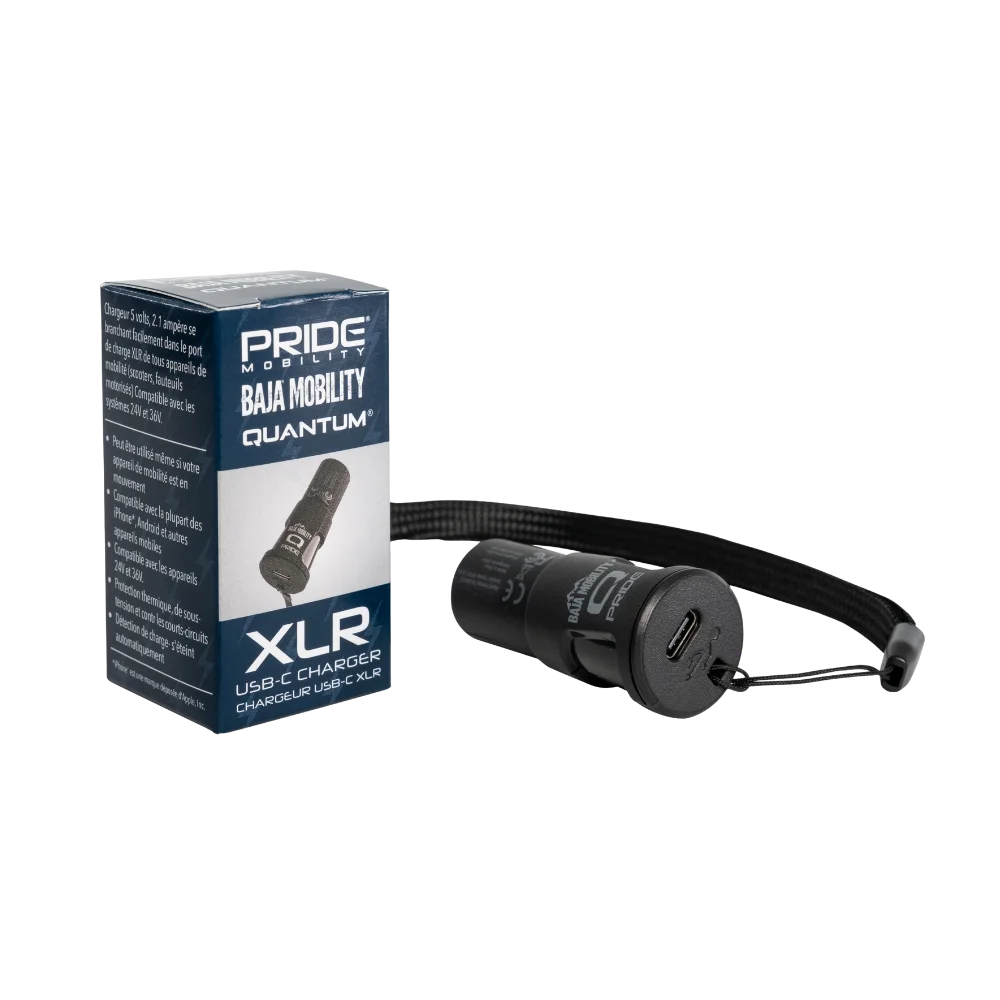 A USB charger comes standard on some power chairs, allowing users to charge electronic devices while on the go by plugging directly into the controller of the chair.
