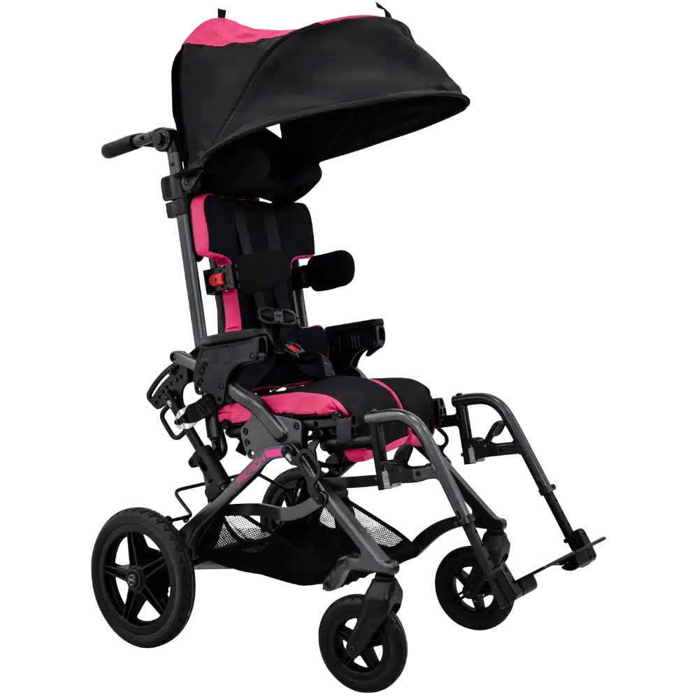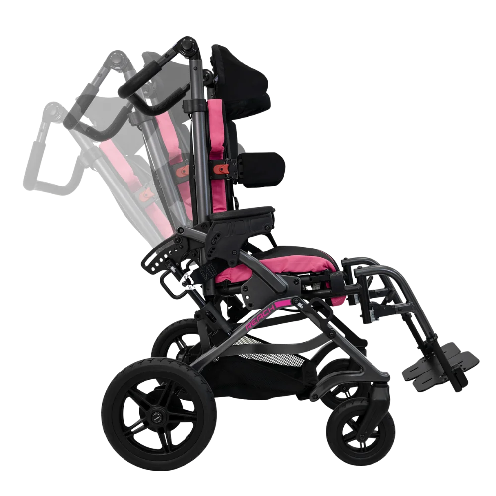 The Reach features RESPOND™ contoured seating, a swivelling front wheel, and a compact fold, making it ideal for everyday mobility at home, in the community, or while travelling. Available in three frame sizes with seat widths from 8‑16 ” and a weight capacity of up to 150 lbs (68 kg), the Reach is built for reliable use with practical standard features and optional accessories for added comfort and support.